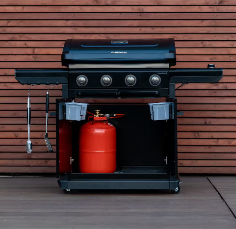 • Gril podporuje umístění až 10 kg PB lahve uvnitř plně uzavřeného vozíku s jednoduchým designem a integrovaným podvozkem, který kryje kolečka.